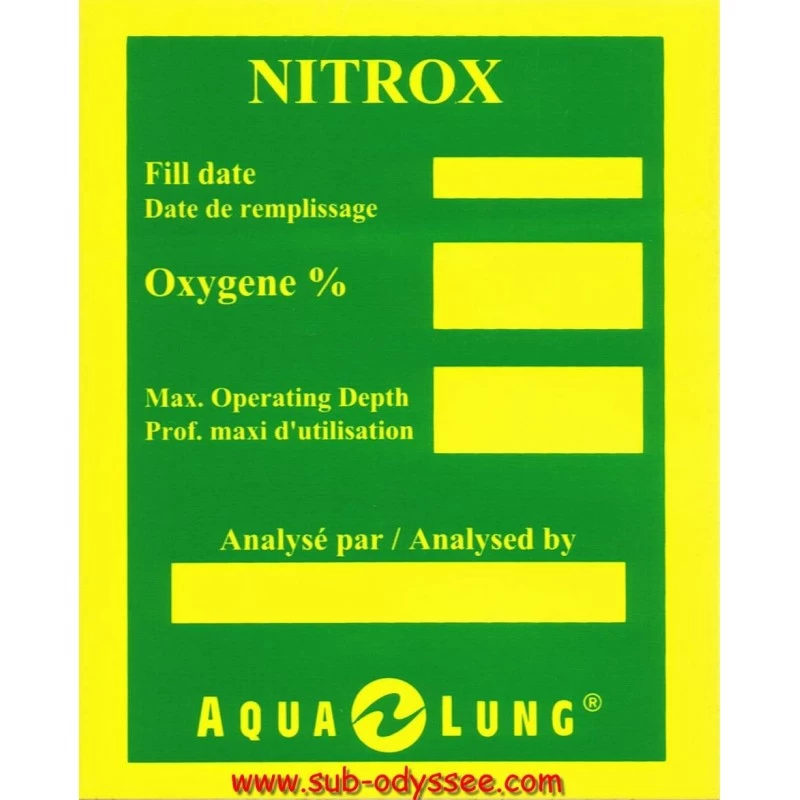 Le sticker Nitrox permet de signaler la nature du mélange, sa composition, & la profondeur maxi d’utilisation.